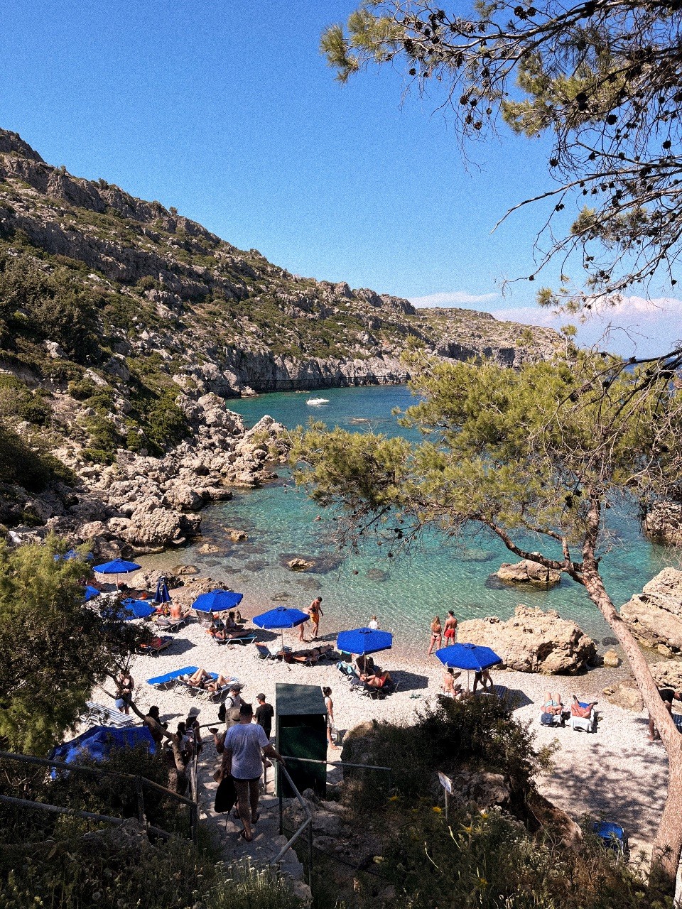 Looking down onto the white pebbles and blue parasols of Anthony Quinn Bay
