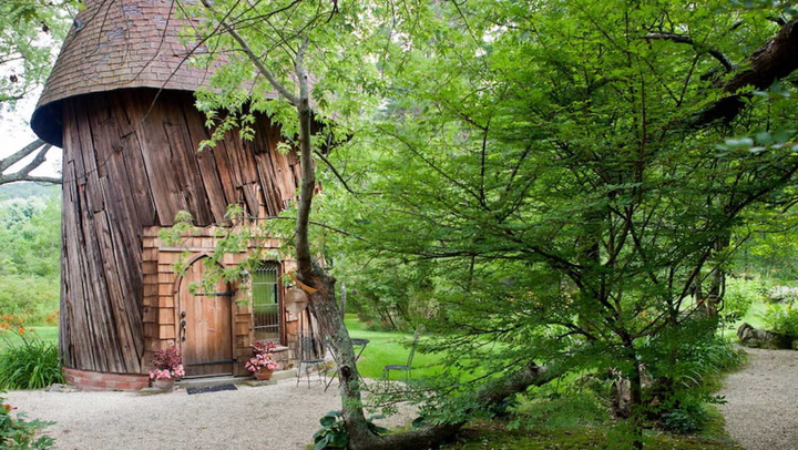Located in the Berkshires, this enchanting wooden storybook tower includes a private pond and a picturesque garden for leisure activities. The French-inspired property spreads across 350 square feet, featuring a lovely upper chamber with a canopied bed, offering views overlooking the treetops.
