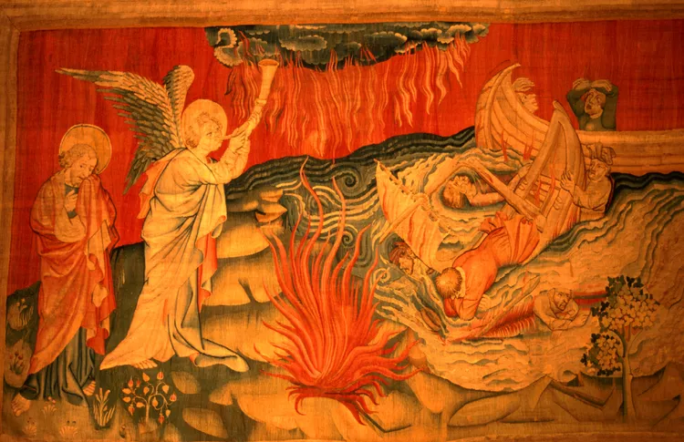 The tapestry was woven in Paris between 1373 and 1382 for Louis I of Anjou. Originally 133 meters (436 feet) long and six meters (20 feet) high, it was designed by Hennequin de Bruges, the foremost painter of the Bruges School, who lived in France from 1368 as an employee of King Charles V (1364 to 1380). He drew inspiration for the images from one of the King’s illuminated manuscripts, which were then woven into 100 separate tapestries by Nicolas Bataille and Robert Poincon over seven years.