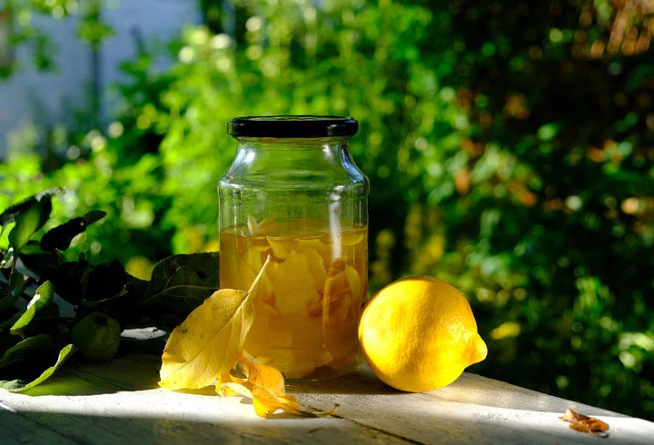 • After four weeks, remove the skins from the alcohol with a strainer and discard. Strain two more times to remove smaller bits of orange. Set aside.