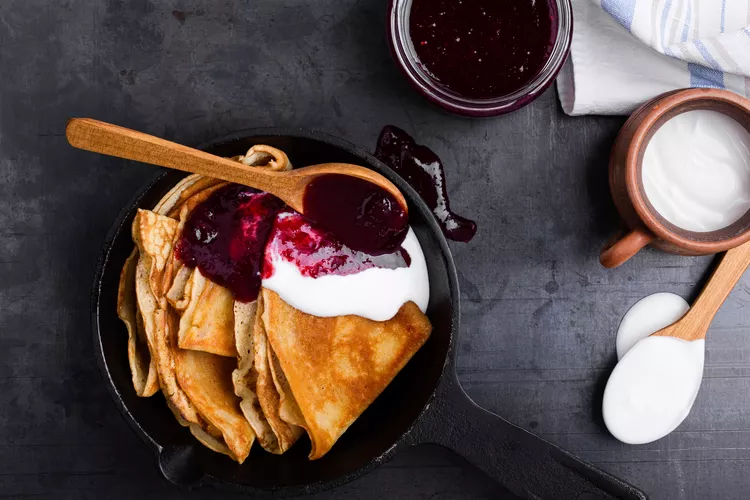 Russian pancakes are often filled in various ways, and it’s common to roll them into burrito-style wraps. Popular sweet fillings include jam, jam mixed with cottage cheese, or honey combined with cottage cheese. For savory options, typical fillings are potatoes mixed with chives and sour cream, or various fish and potato combinations. Caviar, while a more luxurious filling, is also a popular choice. Another common presentation includes pancakes served with a dollop of sour cream alongside jam. You can enjoy them by rolling up the pancake and dipping it into either or both accompaniments. Additionally, toppings such as honey or melted chocolate are delightful options. Unlike other cultures, Russian pancakes are generally not served with syrup, cheese, ham, bacon, or apples. Tea is traditionally served with Russian pancakes, although coffee is also a pleasant alternative.