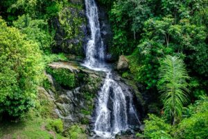 One of the easiest waterfalls to visit in Bali is probably the Layana waterfall, located just east of Ubud. This stunning two-step waterfall can be admired without the need for hiking or paying an entrance fee. In fact, it is conveniently situated next to a warung (a small food shack), where visitors can purchase food or drinks while relaxing in a hut above the falls.