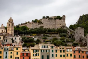 Porto Venereis an enchanting town in the Italian Riviera, celebrated for its picturesque harbor adorned with vibrant houses and the iconic San Pietro Church, which is dramatically situated on a rocky promontory. The narrow, medieval streets lead visitors up to a historical castle, while the main street, accessed through the ancient city gate, is bustling with shops and quaint eateries. Not far from the town is Byron’s Cave, a rocky area by the sea known for its connection to the famous poet.