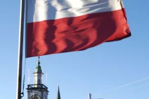 The national flag of Poland consists of a stripe of white on the top and a stripe of red on the bottom. These colors have been in use in the Polish flag for centuries. Before the 20th century, Poland’s flag featured its coat of arms, a white eagle on a red background. Some Polish flags still use the coat of arms; it can be found in a red crest centered in the white stripe of the current national flag.