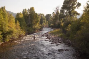 The water rippled as the wind picked up on the pond. I flicked my rod, watching the lure dance above the surface and back into the air — straight into a tree. Henry Hudson, who oversees adventures for Blue Sky and bears no relation to the explorer of the same name, laughed it off and pointed across the shore. “See how the waves are going toward that bank? That’s your spot right there.” I trudged in my waders through the last dregs of snowpack and cast. Nothing. Stick. Nothing. Cattail. Nothing. Nothing. Then resistance, a brief tug-of-war, and finally: a trout, iridescent and speckled, flopping in the net. I was elated. I sent my husband a photo — me dopey and grinning like a golden retriever, my fish slack-jawed and muscling against my grip, Henry Hudson smiling encouragingly over my shoulder — along with a message: “We have to move to Utah.”