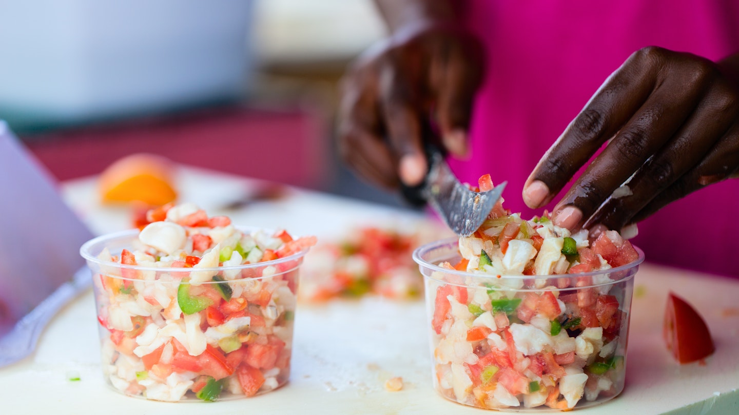 Conch salad, a tangy tangle of conch, onion, tomato, peppers, Scotch bonnet chili, lemon, lime, and orange, is always diced and tossed to order. Cracked conch – tenderized, breaded, and deep-fried strips, served with hot and tartar sauces – is equally beloved.