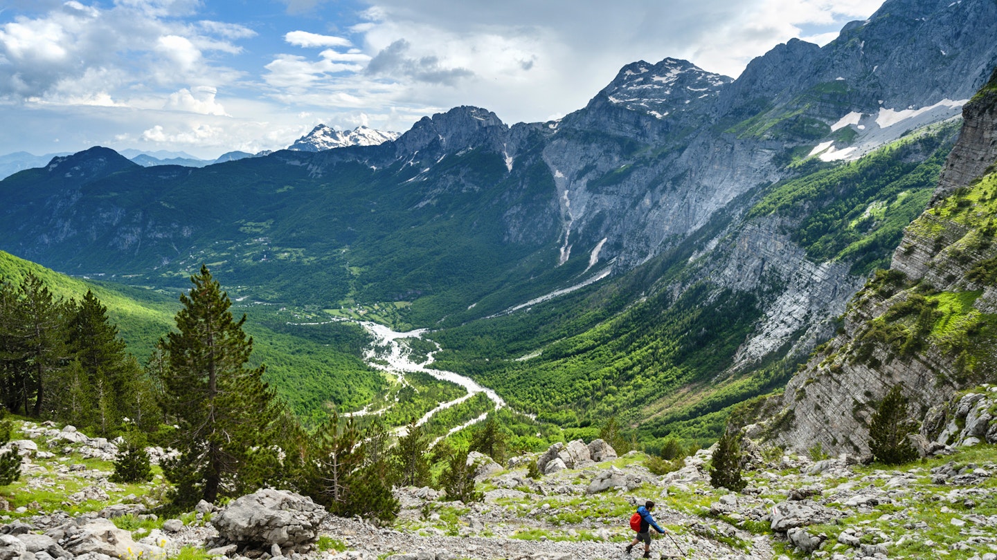 After spending a night in Theth, the Albanian leg of the Peaks of the Balkans trail leads me towards the Valbonë Valley over a rocky pass. Climbing higher, the view soon expands into IMAX mode: giant citadels of rock, meadows tinged blue in the heat haze, eagles riding thermals from the Adriatic.