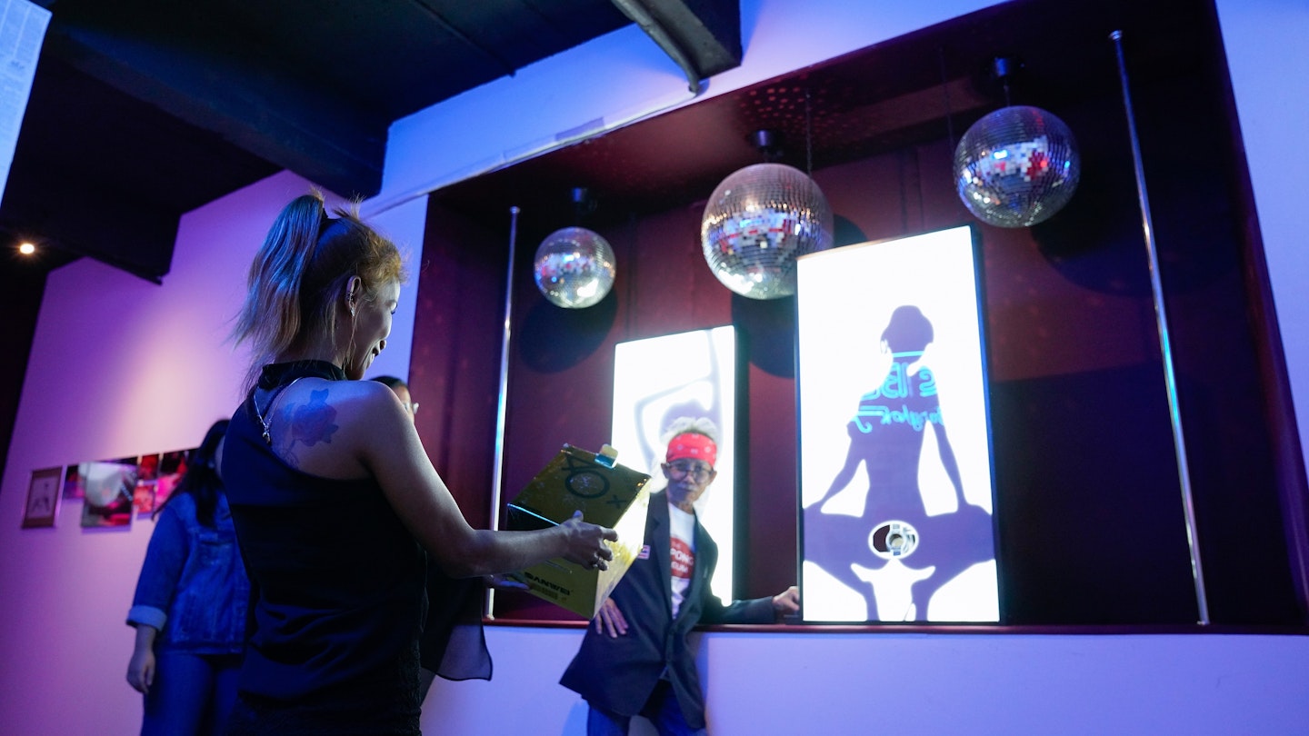 Nearby, a screen shows footage of the act that inspired the creation of the ball-shooting machine, filmed in the district of the Thai capital in which I currently stand. In it, a naked woman launches balls across a bar from her genitals, as an enthusiastic, fully-clothed western man gleefully bats away the projectiles with a table tennis paddle.