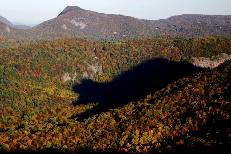 On clear sunny days for about three weeks each fall, the eagerly anticipated and somewhat mystical Shadow of the Bear emerges slowly from behind Whiteside Mountain in Western North Carolina. Beginning at about 5:30 p.m., a small shadow grows and morphs into various shapes, eventually appearing as a giant bear shadow across the treetops of the valley. The entire event takes about 30 minutes. This phenomenon attracts visitors and local residents alike, many hoping to capture a good photograph. Finding the ideal conditions for photography can be hit or miss; however, mountain haze, cloudy conditions, and other little tricks of Mother Nature can obscure the shadow, making good photographic results difficult or impossible to achieve. Moreover, even if you don’t manage to enjoy a good view of the sometimes elusive bear shadow, the Cashiers and Highlands area is well worth a visit. The mountains are stunning, and there are many wonderful attractions and activities, including North Carolina’s most picturesque waterfalls, several great hiking trails, scenic byways, mountainside golf courses, and more.