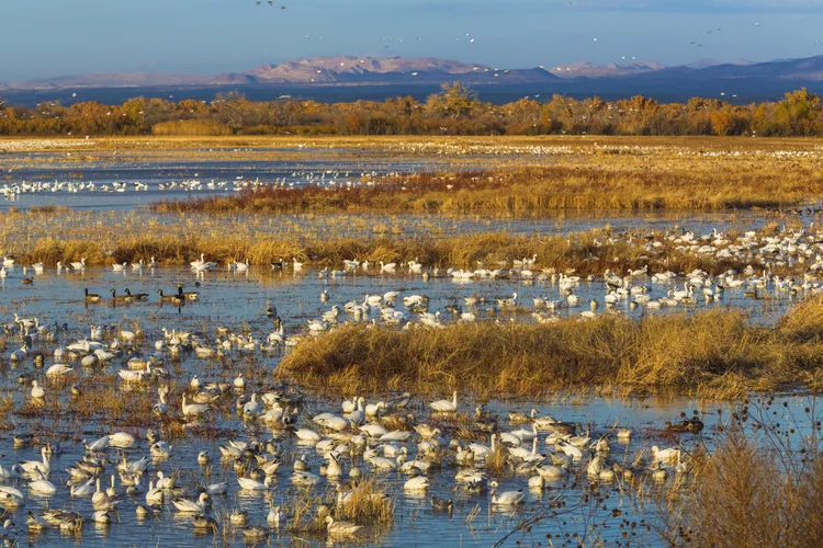 Bosque del Apache National Wildlife Refuge near Socorro, New Mexico, is renowned for its stunning landscapes and significant bird migrations in the fall. This refuge provides a sanctuary for various wildlife species throughout the year. Spanning over 57,000 acres, the area includes habitats for both land and water birds, attracting bird watchers from far and wide.
