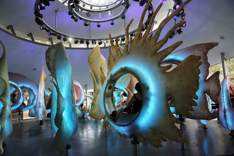 New York City’s SeaGlass Carousel at The Battery offers a unique experience where riders sit inside iridescent fish, spinning alongside others in a beautifully designed aquatic carousel. This one-of-a-kind ride is a delightful attraction for visitors.