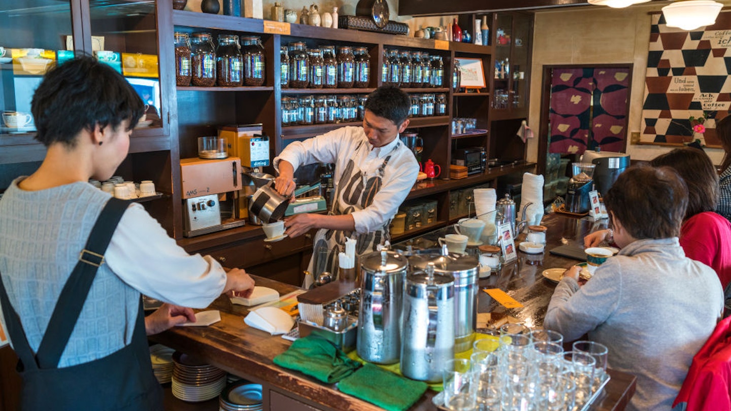 When people in Japan talk about “first wave” (the era that coffee became widely available to consumers as instant coffee), they’re most likely referring to kissaten, the word for coffee shop long before “cafe” entered the national lexicon. When they first began appearing in the early 20th century, kissaten were portals into an exotic world and carried a whiff of intellectual society. Today the word is used to describe a coffee shop that embraces an aesthetic (think deep red velvet seats, low lighting, porcelain cups) and taste that predates the arrival of mass-market chains.