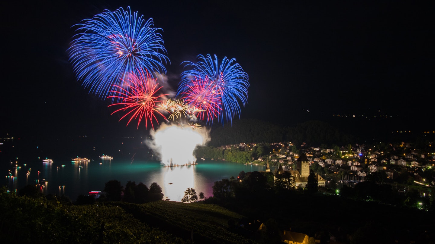 Enjoying fireworks on Lake Thun while sipping champagne from a cozy balcony in Oberhofen, Switzerland.