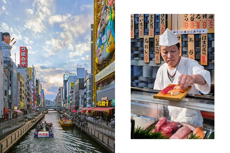 From left: The Dotonbori district of Osaka; preparing nigiri at Yamatoya.