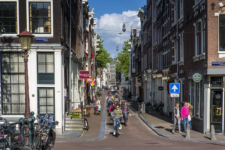 Amsterdam’s 400 km (249 miles) of bike lanes and paths (​fietspaden) make city cycling safe. They usually run along the right sides of streets. Moreover, some two-way lanes are on one side only and typically feature white lines and bike symbols painted on the road or on the reddish-colored path.