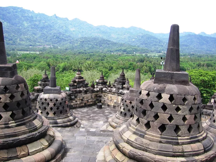 Upon reaching Arupadhatu (the world of formlessness, represented by the four top levels of Borobudur), visitors will encounter perforated stupas housing Buddha statues. Unlike the first four platforms, bordered on both sides with stone, the upper four levels are open, offering expansive views of the Magelang regency and Merapi volcano in the distance.