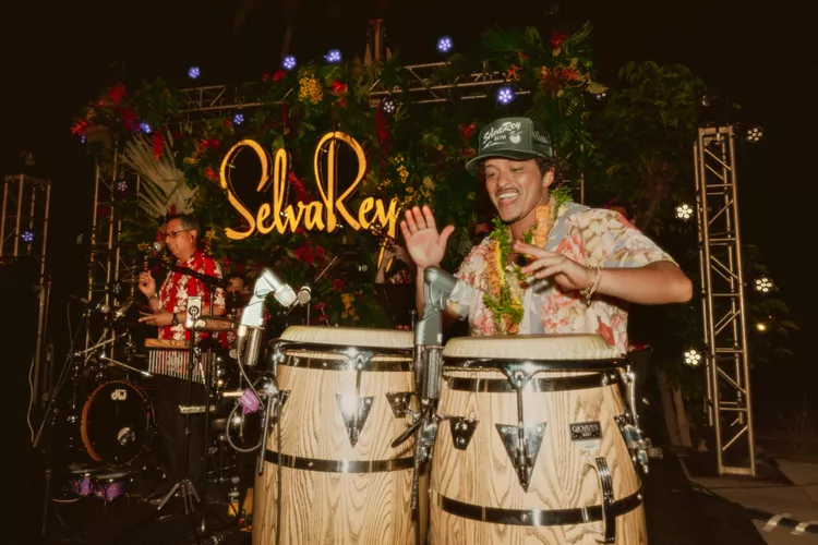 We moved over to the 15,000 square-foot Plantation Estate, transformed into a tropical party scene — and soon enough, Mars was on the stage, just a few feet from me, playing the conga drums and then belting out his hits “Just the Way You Are” and “Treasure.”