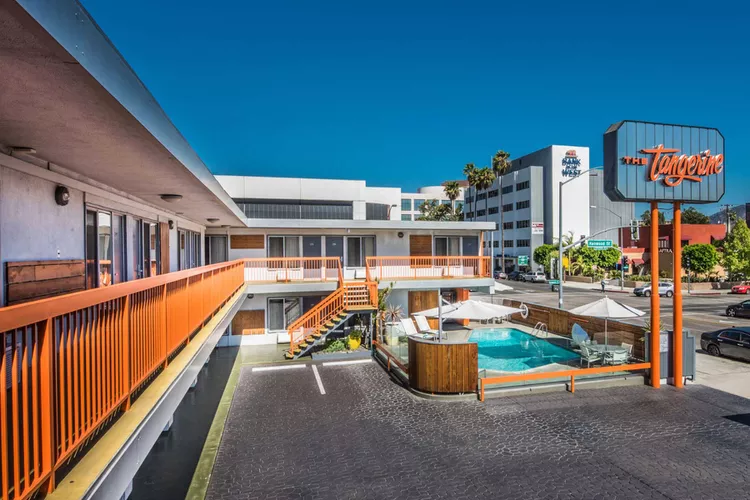 The Tangerine in Burbank boasts a vibrant atmosphere filled with warmth and brightness. This retro-inspired hotel near Universal Studios and the Hollywood Sign features 31 uniquely decorated rooms and offers complimentary breakfast pastries from the renowned Porto’s Bakery, providing easy access to local favorite treats.