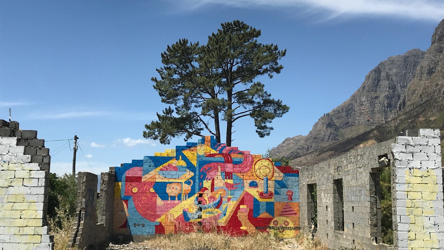 From Pniël, you can freewheel down into the valley where a gently undulating trail runs through the lush greenery beside the Dwars River. It’s about 5km to Kylemore, where the economic divisions that continue to plague South Africa become more apparent: abandoned and squatted housing, such as that used by the artists Gerald Makatees and Ello Xray Eyez for their murals, sit beside the million rand homes of the gated Capolovaro housing estate. Brightening up scrappy Daffodil Park are a couple more murals, including one by 13-year-old Reduwaan, the youngest of the artists to take part in the 2017 festival.