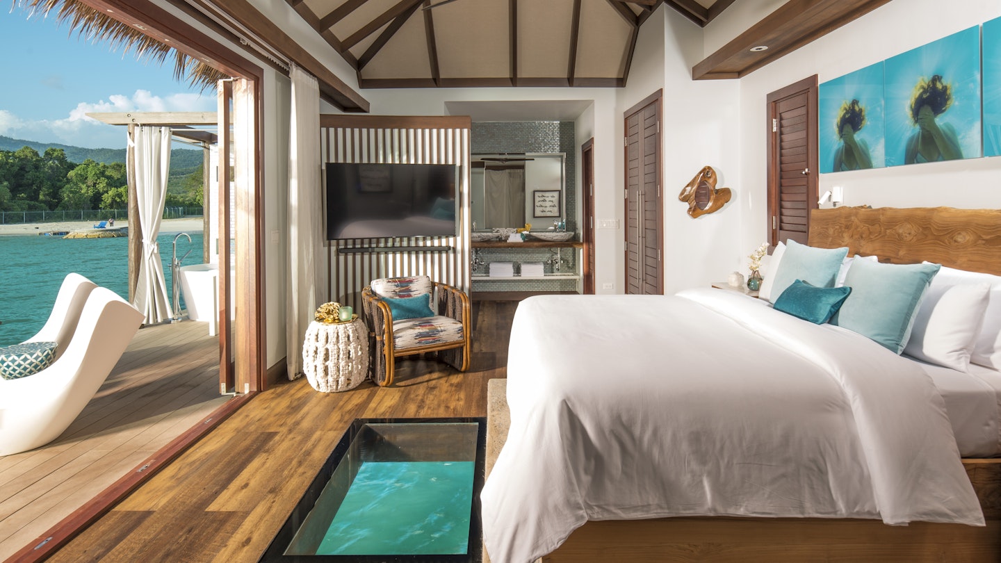 The clear, calm waters surround one of the overwater bungalows at Sandals Royal Caribbean © Sandals Royal Caribbean