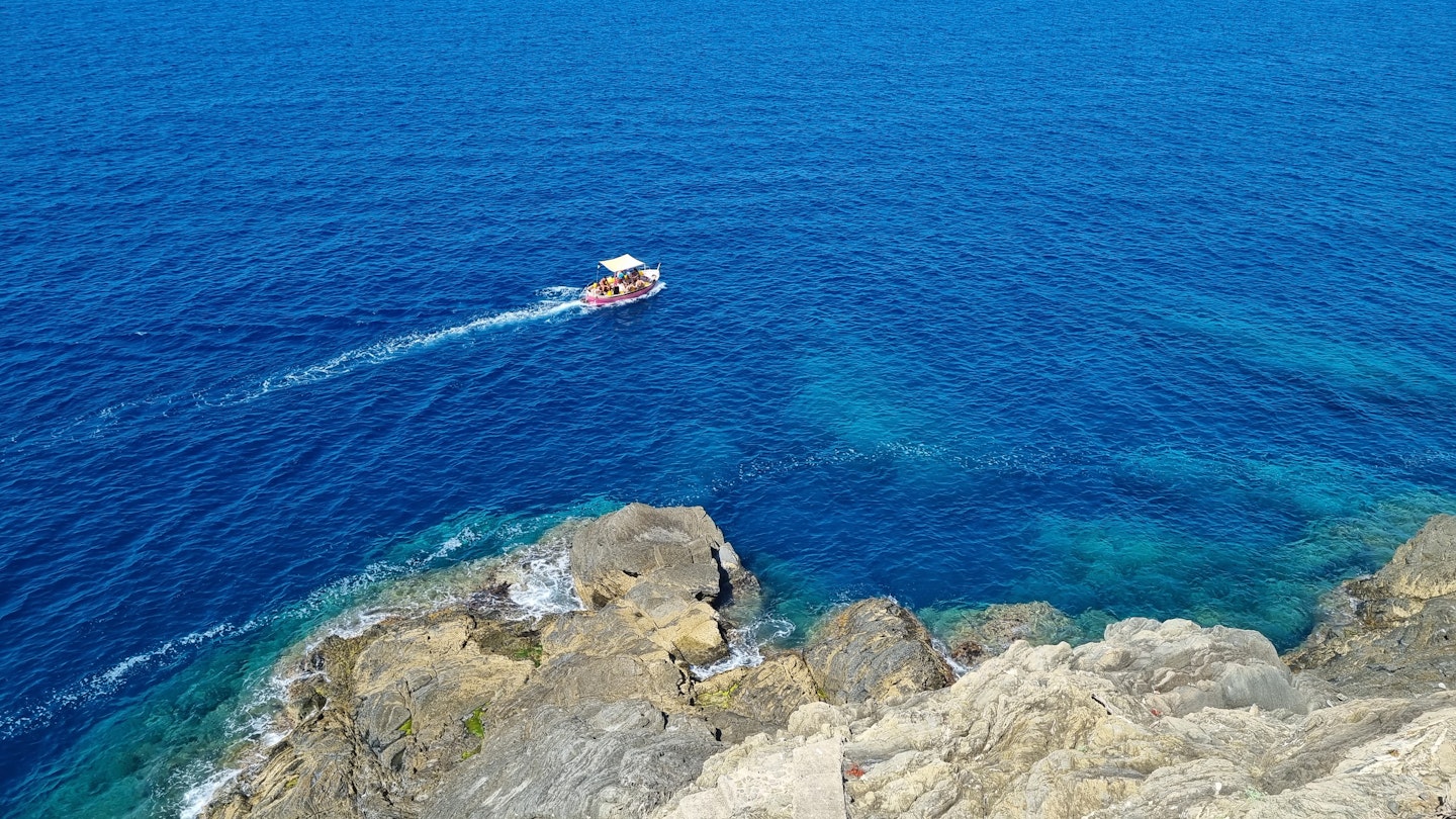 The views out to sea, and backwards to Riomaggiore, are spectacular: you see the castle that tops the village, the entrance to Riomaggiore’s sliver of a harbor, and the Santuario di Nostra Signora di Montenero, the blazing-white church up on high. Below you are the cliffs—layer upon layer of rock, laid one on top of the next like a lasagne. Lapping quietly at them (in summer) is the sea: limpid, Maldives-clear and a bright, rich jade in the sun.