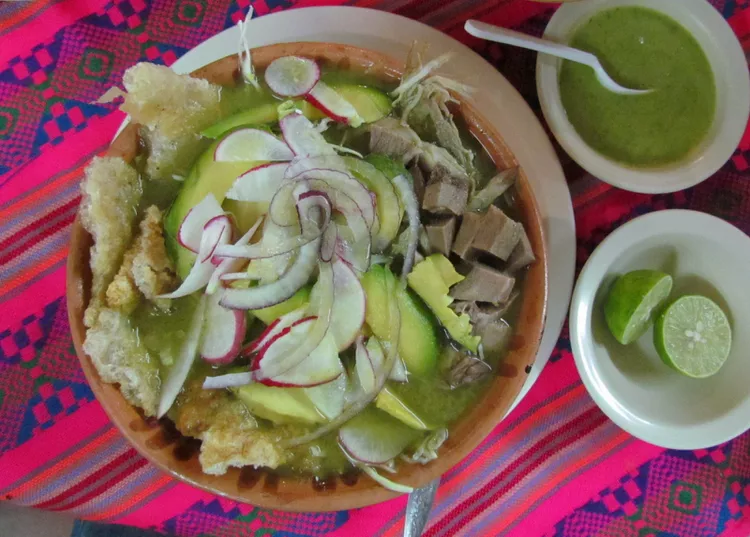 Pozole (sometimes spelled posole) is a soup or stew made with hominy corn. Typically, it is prepared with either pork or chicken stock, and the meat is added on top, accompanied by shredded lettuce and radish slices. Traditionally, pozole is enjoyed with tostadas, crunchy fried corn tortillas, and guacamole. Discover more through a recipe for pozole, or try a non-traditional vegetarian variation that includes mushrooms.