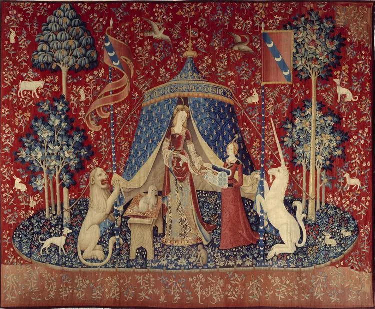 Each panel corresponds to a sense: Touch, Sight, Smell, Taste, and Hearing, concluded by an enigmatic panel titled “A mon seul désir” (To My Only Desire), which some suggest embodies the victory of spiritual understanding over sensory experiences.