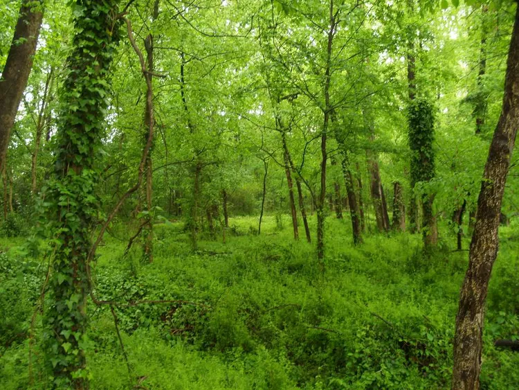 - Thick vines of muscadine grapes and climbing hydrangeas embracing the trunks of ancient trees, evoking a primordial atmosphere.