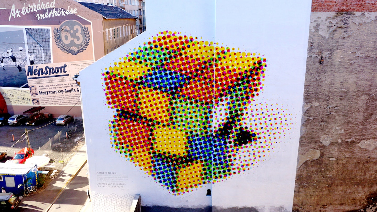 Did you know the Rubik’s Cube was invented in Budapest? Keep walking past the parking lot and look at the next firewall to your left to find a huge painting by urban art collective Neopaint that pays tribute to an iconic Hungarian invention that keeps the world puzzling to this day.
