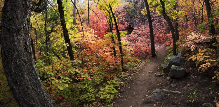 In this area, you will find the largest and most concentrated stand of bigtooth maples, which display stunning red foliage, while the scrub oaks present a beautiful yellow backdrop, creating a spectacular scene. Most visitors opt to hike through the forest trails that ascend the mountain. The ascent is manageable until nearing the summit. The one-mile hiking trail is relatively easy and takes you through the most scenic parts of the canyon, ideal for leaf-peeping. Upon reaching the canyon head, you have the option to either turn back or continue on a 6.5-mile loop. One spur of the trail leads to a ridge, offering breathtaking views of the valleys below.