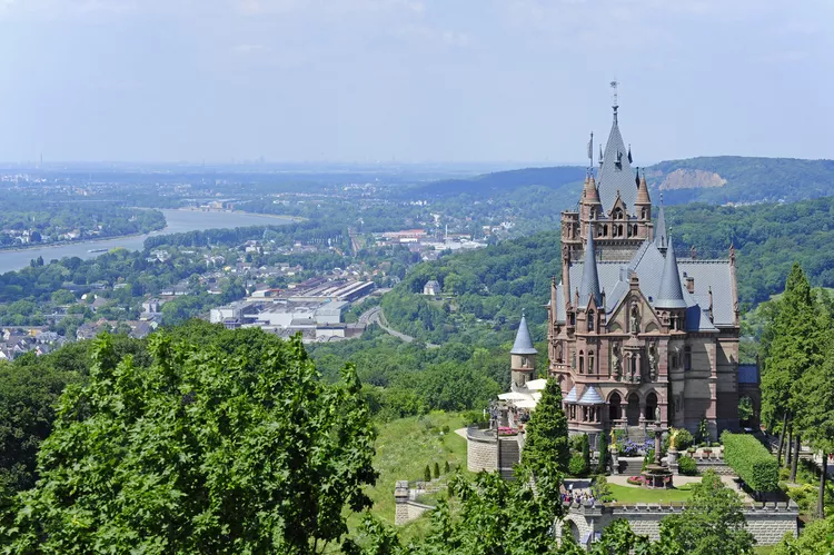 Driving from Berlin to Belgium, a short detour will bring you to a castle just a short distance from Bonn and Cologne. Drachenfels (Dragon’s Rock) refers to the medieval ruins at the top of the peak, but there is also a modern and impressive interpretation of a castle three-quarters of the way up the slope.