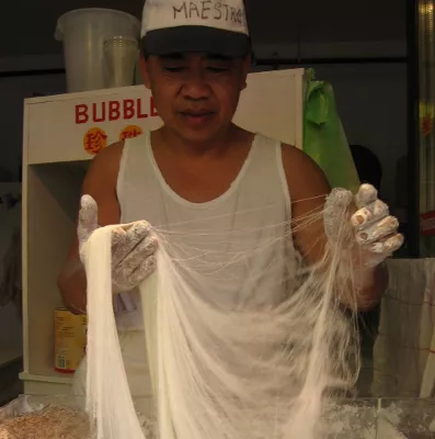 Dragon beard candy garners interesting descriptions from those who taste it. When I asked a group of women watching Johnny Chin craft the candy, each had a different opinion: one likened it to taffy, another to baklava (but less sticky), and a third compared it to nougat.