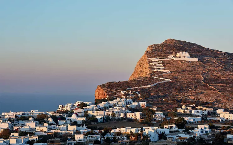 Though it is just an hour away by jet boat, Folegandros feels like Santorini’s polar opposite: quiet, understated, almost timeless. The island is tiny—with a population of less than 800—yet despite its small scale, the landscape is big on drama. Like the other islands in the archipelago, Folegandros is a partially submerged mountain, whose sheer northern side plunges straight into the sea. From the Church of Panagia, or the Virgin Mary, which sits at the top of a strenuous switchbacked path above the tiny capital, Chora, you can take in most of the island. It stretches out in a narrow finger to the west, the traces of abandoned farming terraces still visible on its arid flanks, and forms a distinctive hourglass shape that is pinched, in the middle, to a width of just a few hundred yards.