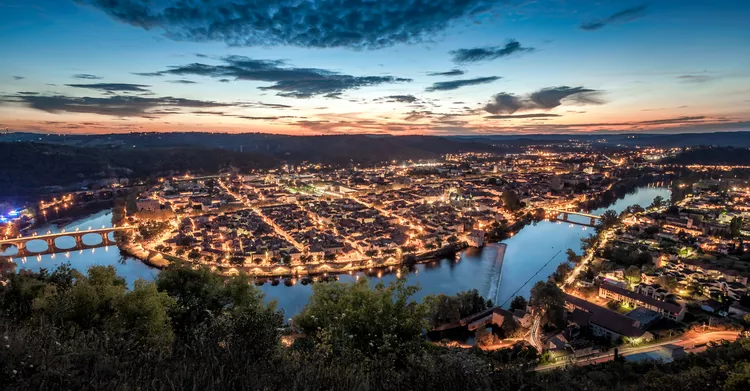 Tucked into a rounded nook of the Lot River, Cahors is a lovely medieval city almost entirely surrounded by water. As the heart of wine country, the city’s most memorable landmark is the Valentré Bridge, along with the nearby ramparts and the cathedral.