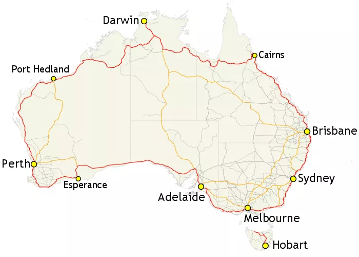 Highway 1 is a network of roads that encircles Australia’s coastline. For the specific route between Perth, the capital of Western Australia, and Darwin, the capital of the Northern Territory, travelers will need to begin their journey on the road known as Brand Highway.