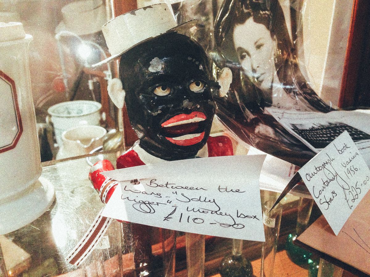 During my visit today, I encountered several antiques that sparked controversy, which prompted my desire to understand your perspectives on them. The realm of antiquing, in my opinion, ought to serve as a reflection of specific historical periods. For instance, some antiques, such as the money box depicted above, may understandably be offensive to many. Conversely, items like the Al Jolson album (illustrated below) might initially appear offensive, particularly with the artist in blackface on the cover. However, upon further investigation into Al Jolson’s contributions, one would observe that he notably advocated for African American rights as early as the 1900s.