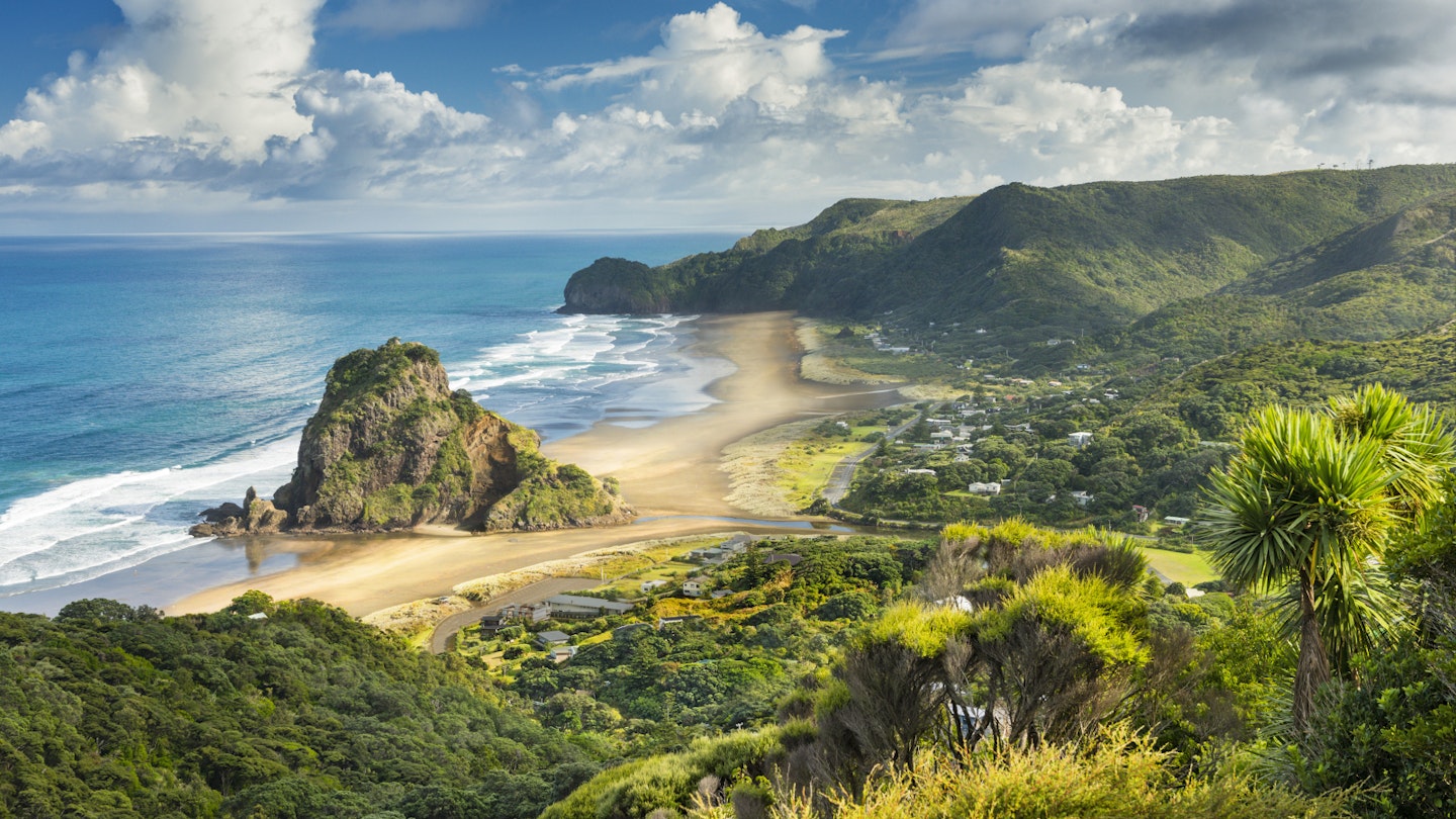 After a 30-minute drive west, the road corkscrews into hills carpeted with nīkau palms, some as giant as pantomime beanstalks. It then careers down the other side to meet Piha’s sheer cliffs, pock-marked with nesting sites for gulls. It’s mid-afternoon when the campervan trundles into Piha, passing scattered weatherboard houses and parking in front of a beach being pounded by waves. This volcanic sand has Marvel-superhero strength, so rich in iron it will stick to a magnet.