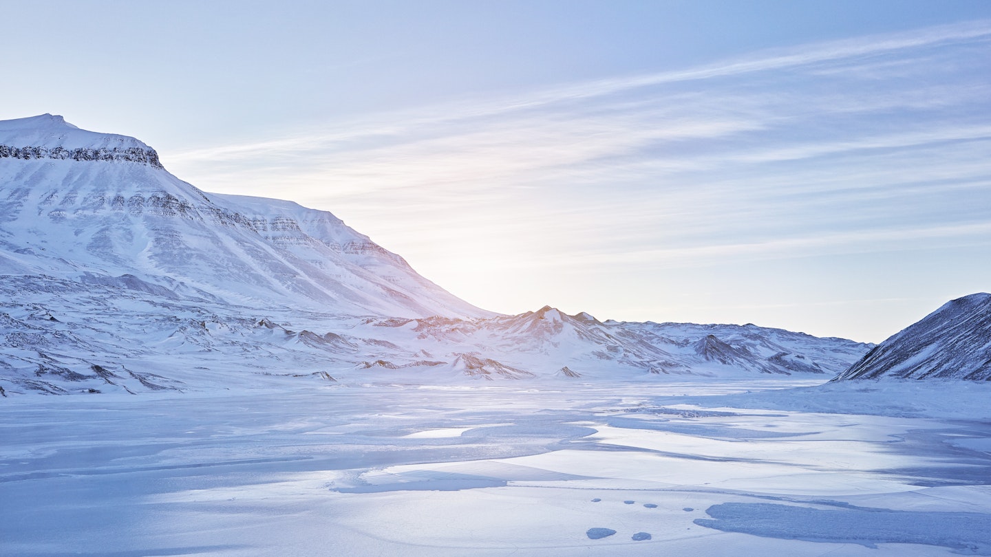 The storms of the previous days have cleared. The sun, which has recently appeared to the winter-weary inhabitants of Longyearbyen for the first time in five months, is shining. Svalbard is suddenly revealed – and it is golden, gilt-edged, and dazzling. We travel through a broad glacial basin, mountains swooping up on either side, their peaks crisp against the bluest of blue skies.