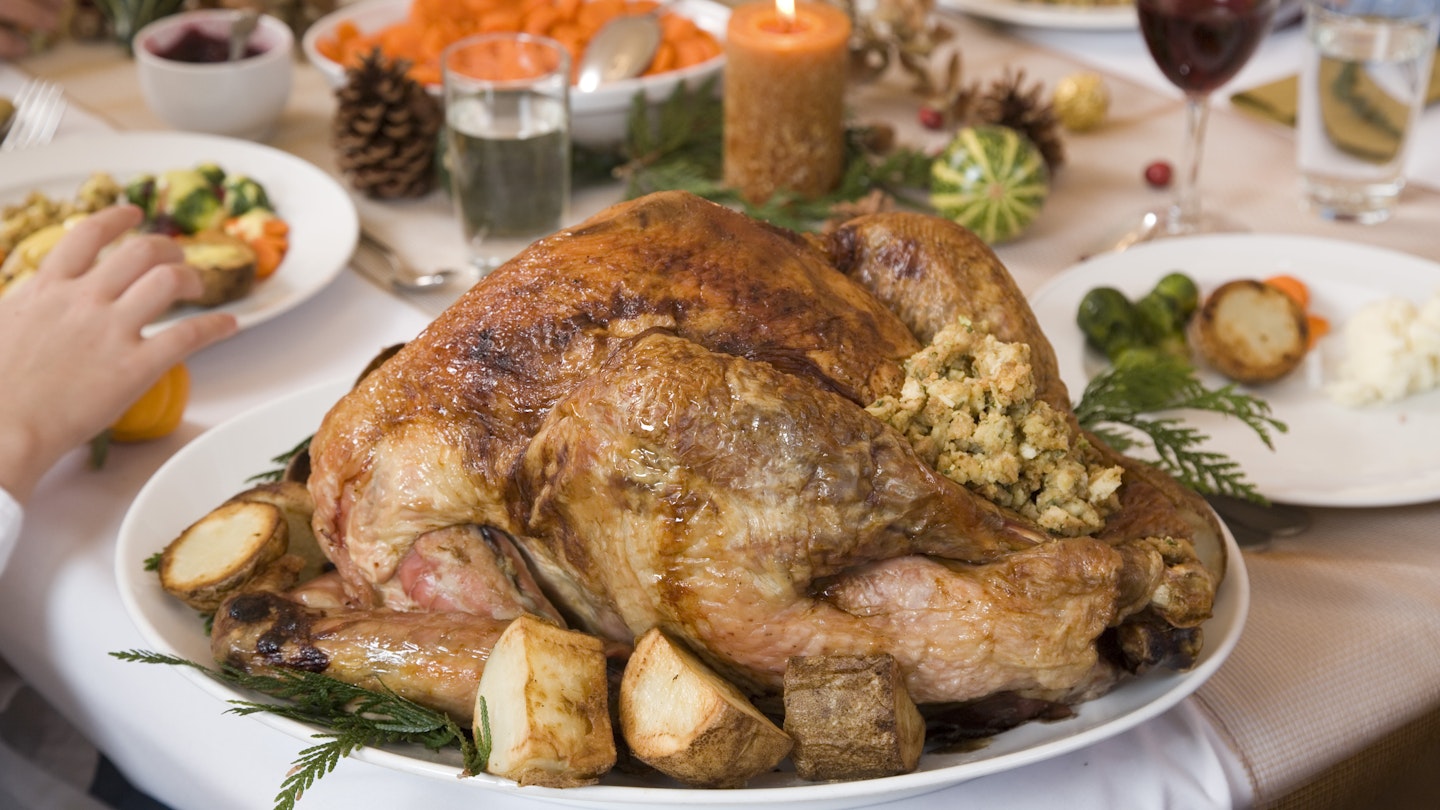 Christmas dinner in the UK is all about the gut-busting roast. This typically consists of roast turkey – chicken and goose are also popular choices – served with all the trimmings, from stuffing, roast potatoes, parsnips, and Brussels sprouts to pigs in blankets (mini sausages wrapped in bacon) and devils on horseback (dates wrapped in bacon). All of this is washed down with lashings of gravy, a dollop of cranberry jelly, and a healthy scoop of bread sauce.