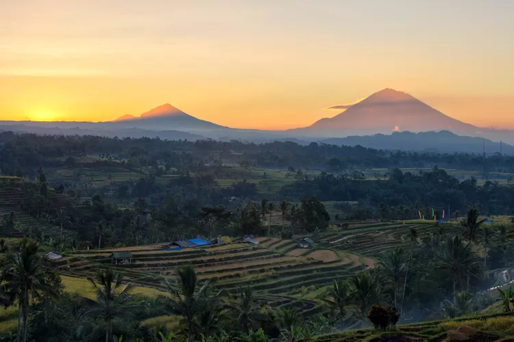 At over 10,300 feet, the mountain influences the island’s climate by blocking the passage of airborne moisture from west to east. The terrain east of Gunung Agung is arid as a result.