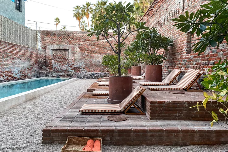 If you’re seeking arts, culture, and waterside adventure in Mexico, the Baja Club Hotel in La Paz delivers on all fronts. Although the outside appears unassuming, the stately entryway reveals an oasis for travelers desiring a retreat. Upon stepping through the carved wooden doors, guests enter the original 1910 villa, formerly owned by an affluent family linked to the region’s historical pearl farming culture. While La Paz’s pearling industry has faded, the cream-colored facade commemorates a bygone era.