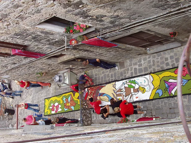 Many Italian towns host an infiorata, or flower art festival, during May and June. Multi-colored flower petals are transformed into stunning works of art on the streets or in abbeys, offering a breathtaking sight. In some locations, the infiorata may consist of a simple flower-petal design in front of the church. However, more elaborate infiorate involve the creation of various tapestries, each depicting a different picture but often centered around a thematic concept.