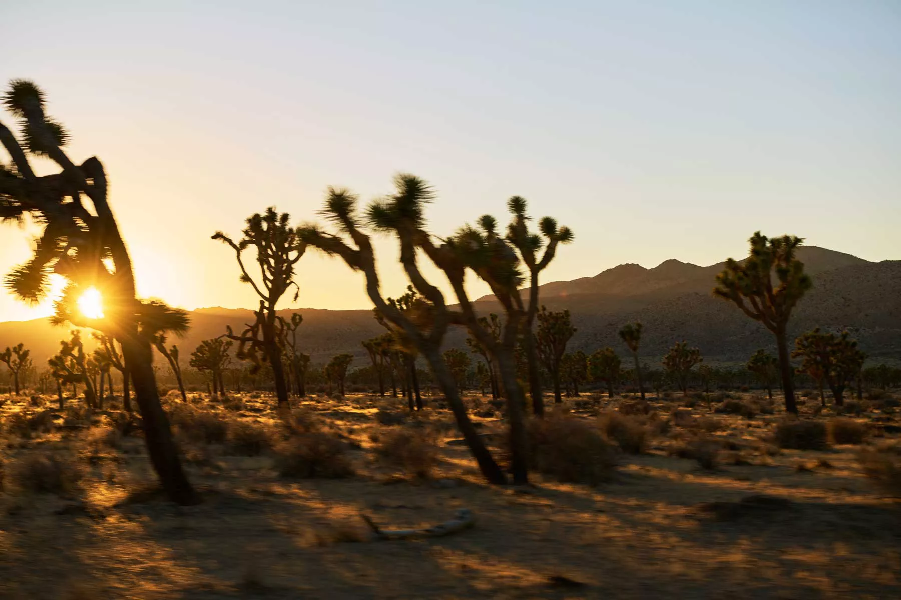 Joshua Tree refers both to the national park, an expanse comparable to Rhode Island where the Mojave and Colorado deserts merge, and to the actual town—a string of small communities draped across the park’s northern rim. Located about a two-hour drive from Los Angeles, the region stretches along Highway 62 for approximately 30 miles. You know you’re getting close when the pavement starts to shimmer from the heat and wind turbines dot the view like enormous white palms.