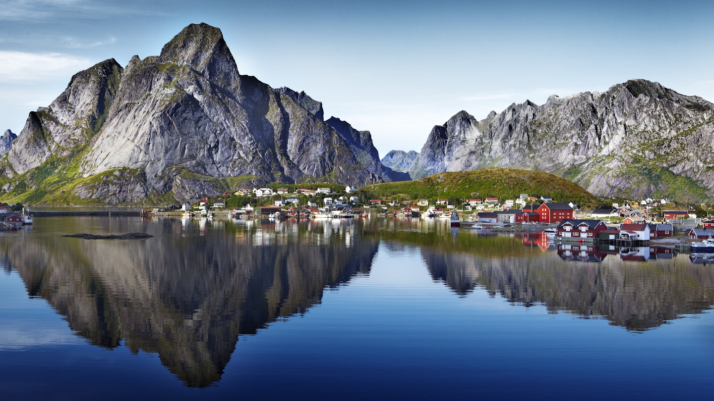 The tiny wooden fishermen’s huts that cling to the shore of Norway’s Lofoten Islands look too flimsy to survive in this prehistoric landscape. Towers of granite loom over these insubstantial red and yellow structures, which are scattered along the water’s edge like Lego bricks tossed aside by a petulant giant.