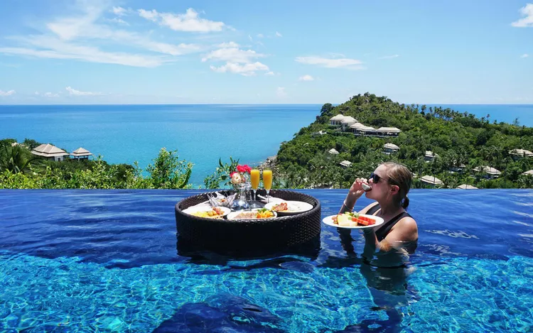You’ve probably seen it on Instagram, a bikini-clad woman standing navel deep in an infinity pool with a turquoise ocean in the background next to a floating spread of your favorite breakfast foods. This new trend, appropriately called “floating breakfast,” is the latest luxury hotel offering popping up around the world.