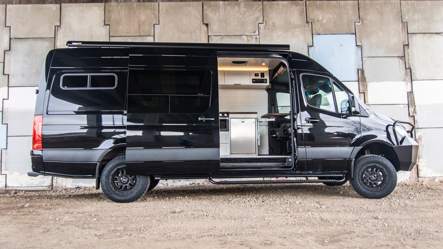 The van includes a raised queen-sized bed in the rear of the cabin, a custom L-shaped leather dinette seating area with built-in storage, a dry flush toilet, an indoor shower, cabinets and drawers, a gas cooker, and a cozy kitchen area. The interior is decked out with a 23-inch TV, a custom ski rack, ceiling fans, and an additional outdoor shower. Moreover, it offers different lighting zones and a solar panel on the roof for off-grid living.