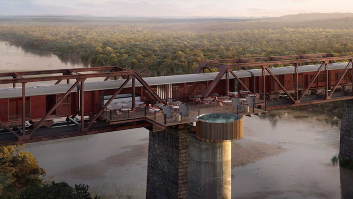 Inside the train, guests will be greeted with glass-walled rooms, allowing them to take in the expansive views all day long. The train also comes complete with its own deck and pool, enabling guests to swim high above the crocodiles, hippos, buffalos, and elephants swimming in the river water below.