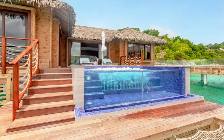 The bungalows have made headlines – and not just because they’re the island’s first overwater room type. Each adult-only unit includes its own infinity plunge pool and a hammock that hangs over the ocean. Consequently, soon after checking in, the private deck, glass floors, complimentary snorkeling gear, and direct ocean entry are sure to become daily necessities.