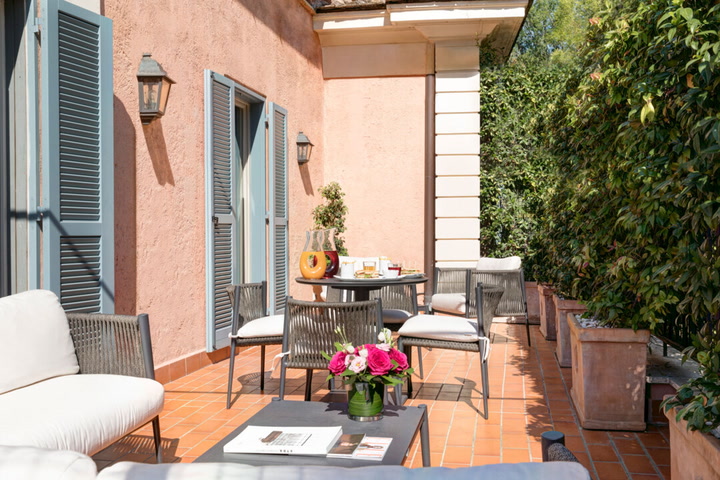 The balance comes from comfortable, plush seating with charming, original cushions by Fornasetti, Toscana armchairs, and eye-catching lamps from Fontana Arte, alongside modern furniture and luxurious fabrics. These suites boast tranquil views of the garden below.