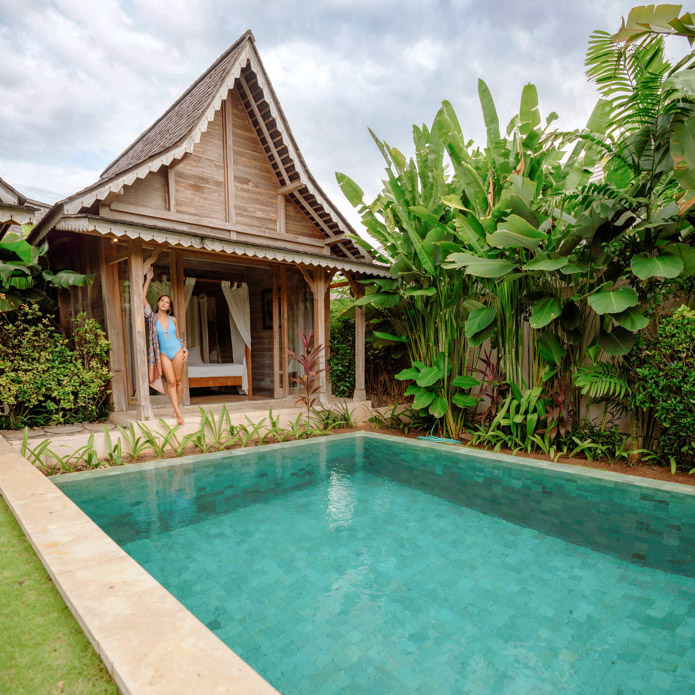 Villa Du Bah is included within the Mannao Estate, a series of luxurious villas nestled along a secluded path bordered by rice fields. Featuring three independent bedrooms influenced by traditional Javanese joglo architecture, each accompanied by private bathrooms and pool access, Villa Du Bah caters perfectly to family and friend groups of up to six individuals.